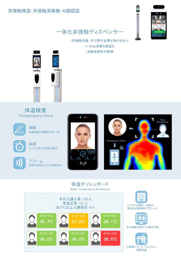 2020年10月2日 管理者 Uncategorized サーモグラフィーで測定してAIによる高性能の顔認証で自動検出します。人手もかけずに無人検温ができる設計の設置型の非接触検温&ディスペンサーですから、病院、学校、オフィスの受付、飲食店、工事現場、介護施設、スーパー、デパートなどでご利用いただけます。 0